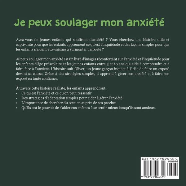 Avez-vous de jeunes enfants qui souffrent d'anxiété ? Vous cherchez une histoire utile et captivante pour que les enfants apprennent ce qu'est l'inquiétude et des façons simples pour que les enfants s'aident eux-mêmes à surmonter l'anxiété ? Je peux soulager mon anxiété est un livre d'images réconfortant sur l'anxiété et l'inquiétude pour les enfants d'âge préscolaire et les jeunes enfants entre 3 et 10 ans qui aide à comprendre et à faire face à l'anxiété. L'histoire suit Oliver, un jeune garçon inquiet à l'idée de faire un exposé devant sa classe. Grâce à des stratégies simples, il apprend à gérer son anxiété et à faire son exposé en toute confiance. À travers cette histoire réaliste, les enfants apprendront :Ce qu'est l'anxiété et ce qu'on peut ressentir Des stratégies d'adaptation simples pour aider à gérer l'anxiété L'importance de chercher du soutien auprès de ses proches Qu'ils ont le pouvoir de s'aider eux-mêmes à se sentir mieux lorsqu'ils sont anxieux. Je peux soulager mon anxiété est une ressource inestimable pour les jeunes enfants et les personnes qui s'occupent d'eux. Son message rassurant et ses adorables illustrations encouragent les enfants à prendre en charge leur propre santé mentale et leur permettent de se sentir plus confiants et en contrôle. Qu'on le lise à la maison ou en classe, Je peux soulager mon anxiété est un outil indispensable pour les parents qui souhaitent enseigner ce qu'est l'anxiété aux enfants d'une manière douce et adaptée à leur âge. Il sera certainement un ajout très apprécié à la bibliothèque de tout enfant. Aidez votre enfant à gérer son anxiété dès aujourd'hui en cliquant sur ajouter au panier ou acheter maintenant.