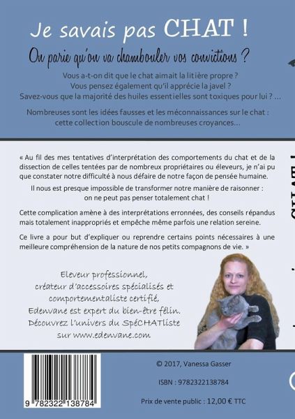 Nombreuses sont les idées fausses et les méconnaissances sur le chat de compagnie, même chez les passionnés et les connaisseurs : la collection "Je savais pas CHAT !" bouscule de nombreuses croyances.Une comportementaliste professionnelle du chat vous explique certains comportements mal interprétés par l'humain et les besoins naturels de nos petits territoriaux car même si on les aime, on ne peut pas penser totalement chat !Ce livre a pour but d'expliquer ou reprendre certains points nécessaires à une meilleure compréhension de la nature de nos petits compagnons.