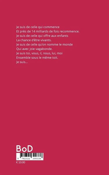 Je suis de celle qui commenceEt près de 14 milliards de fois recommence.Je suis de celle qui offre aux enfantsLa chance d'être vivants.Je suis de celle qu'on nomme le mondeQui avec joie vagabonde.Je suis toi, vous, il, nous, lui, moiEnsemble sous le même toit.Je suis...