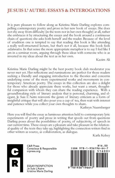 Je Suis L’Autre: Essays and Interrogations, is a collection of lyric criticism that speaks to a rapidly changing literary landscape, with elements of personal narrative, craft analysis, and cultural commentary. By offering a hybrid approach to scholarly writing, Darling’s prose establishes a poetic sensibility as it examines a wide range of recent experimental and collaborative works of literature. The diverse texts discussed in this essay collection include Julie Marie Wade’s Wishbone, Sarah Manguso’s The Guardians, G.C. Waldrep and John Gallaher’s Your Father On The Train Of Ghosts, Anne Boyer’s Garments Against Women, Suzanne Scanlon’s Her 37th Year: An Index, and many others. Throughout Darling’s book, recent works of literature offer a point of entry to more ambitious questions about voice, affect, and conscious experience.