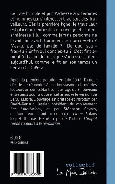 Ce livre humble et pur s'adresse aux femmes et hommes qui s'intéressent au sort des Travailleurs. Dès la première ligne, le travailleur est placé au centre de cet ouvrage et l'auteur s'intéresse à lui, comme jamais personne ne l'avait fait avant. Comment te nommes-tu ? N'as-tu pas de famille ? De quoi souffres-tu ? Enfin qui donc es-tu ? C'est finalement à chacun de nous que s'adresse l'auteur aujourd'hui, comme le fit en son temps un certain G. DuPérat...Après la première parution en juin 2012, l'auteur décide de répondre à l'enthousiasme affirmé des lecteurs en complétant son ouvrage de 3 nouveaux entretiens pour proposer cette nouvelle version de Je.Suis.Libre. L'ouvrage est préfacé et introduit par David Renaud-Kessler, président du mouvement Les Libertariens, et par Stéphane Geyres, co-fondateur et auteur du projet Libres ! dans lequel Thomas Heinis a publié l'article L'impôtmène toujours à la révolution.