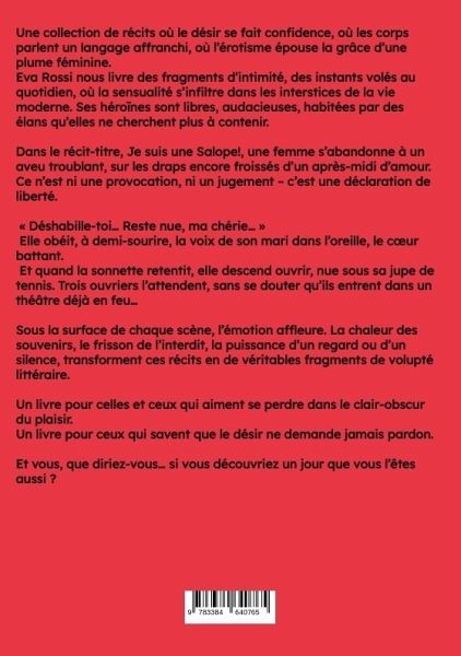 Une collection de récits où le désir se fait confidence, où les corps parlent un langage affranchi, où l'érotisme épouse la grâce d'une plume féminine.Eva Rossi nous livre des fragments d'intimité, des instants volés au quotidien, où la sensualité s'infiltre dans les interstices de la vie moderne. Ses héroïnes sont libres, audacieuses, habitées par des élans qu'elles ne cherchent plus à contenir.Dans le récit-titre, Je suis une Salope!, une femme s'abandonne à un aveu troublant, sur les draps encore froissés d'un après-midi d'amour. Ce n'est ni une provocation, ni un jugement - c'est une déclaration de liberté.« Déshabille-toi... Reste nue, ma chérie... »Elle obéit, à demi-sourire, la voix de son mari dans l'oreille, le coeur battant.Et quand la sonnette retentit, elle descend ouvrir, nue sous sa jupe de tennis. Trois ouvriers l'attendent, sans se douter qu'ils entrent dans un théâtre déjà en feu...Sous la surface de chaque scène, l'émotion affleure. La chaleur des souvenirs, le frisson de l'interdit, la puissance d'un regard ou d'un silence, transforment ces récits en de véritables fragments de volupté littéraire.Un livre pour celles et ceux qui aiment se perdre dans le clair-obscur du plaisir.Un livre pour ceux qui savent que le désir ne demande jamais pardon.Et vous, que diriez-vous... si vous découvriez un jour que vous l'êtes aussi ?