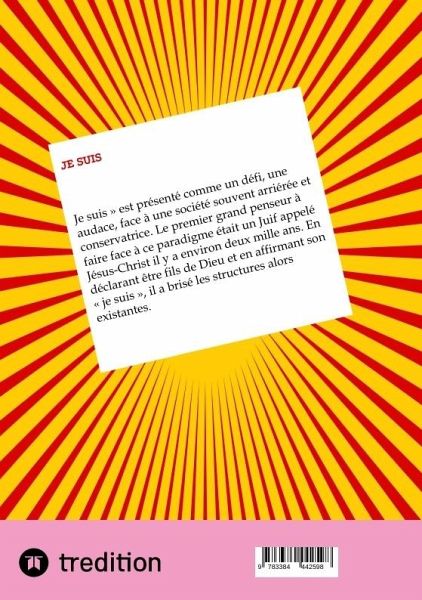 « Je suis » est présenté comme un défi, une audace, face à une société souvent arriérée et conservatrice. Le premier grand penseur à faire face à ce paradigme était un Juif appelé Jésus-Christ il y a environ deux mille ans. En déclarant être fils de Dieu et en affirmant son « je suis », il a brisé les structures alors existantes. Inspiré par cet exemple, ce livre donne un cri de liberté que tout être humain doit expérimenter. Nous ne sommes pas ce que les autres disent, et nous sommes souvent la personnalité que nous créons. Nous devons être nous-mêmes avec la vérité nue et brute. Pour donner…mehr
