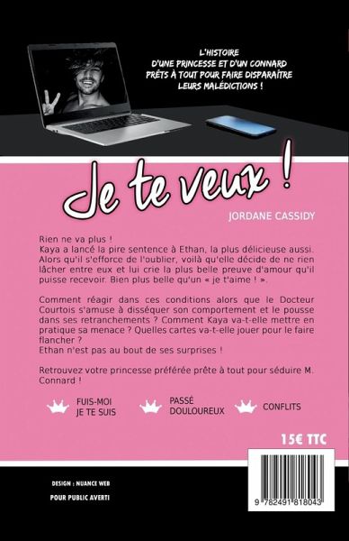 out est compliqué dans l'amour ! Il y a dans l'amour plus que de l'amour. La joie, la tristesse, le désir, l'envie, la jalousie, l'amertume, la colère, la peur, le manque etc. Autant de sentiments qui alimentent l'amour, mais aussi qui le font naître. Jordane Cassidy axe ses romances autour d'une psychologie approfondie des personnages entraînant son lecteur dans un grand huit des émotions qui ne le laissera pas indemne. De formation littéraire, c'est en écrivant des fanfictions pour un manga qu'elle s'est essayée à l'écriture. Avoir un cadre déjà défini lui permettait alors de prendre confiance et d'acquérir l'engouement de lecteurs saluant son style : entre familier et soutenu, mélangeant humour, amour et action. Après une pause de quelques années, elle est revenue sur son clavier, mais cette fois-ci pour écrire une histoire sortant entièrement de son imagination qu'elle commencera à éditer en 2015, une comédie sentimentale érotique en plusieurs tomes : Je te veux !, où elle prend le temps de développer les sentiments de deux personnages blessés dans leur coeur, entre surprises, déceptions, interrogations, joies, colères, culpabilité, égoïsme. Le succès ne se dément pas. Elle touche rapidement de nombreuses lectrices saluant la complexité de ses personnages malgré l'humour jamais très loin. Elle récidive ensuite avec une autre romance, À votre service !, un feel good où là encore, elle laisse parler sa plume pétillante et addictive. Depuis, elle écrit de la littérature sentimentale en autoédition et elle s'éclate à vous présenter son univers. Venez prendre le grand huit des émotions. N'attendez plus ! Lisez ses histoires !