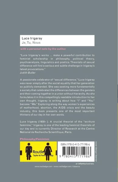 'These translations of Luce Irigaray's works will make a powerful contribution to feminist scholarship in philosophy, political theory, psycho-analysis, linguistics and poetics. Theorists of sexual difference will find a serious and subtle challenge in Irigaray's latest provocations.'- Judith Butler