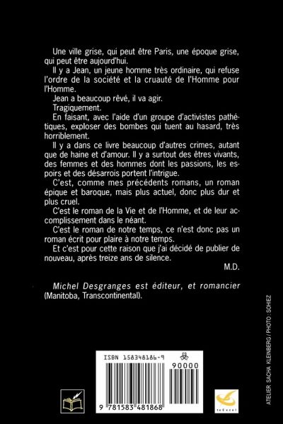 Une ville grise, qui peut etre Paris, une epoque grise, qui peut etre aujourd'hui. Il y a Jean, un jeune homme tres ordinaire, qui refuse l'ordre de la societe et la cruaute de l'Homme pour l'Homme. Jean a beaucoup reve, il va agir. Tragiquement. En faisait, avec l'aide d'un groupe d'activistes pathetiques, exploser des bombes qui tuent au hasard, tres horriblement. Il y a dans ce livre beaucoup d'autres crimes, autant que de haine et d'amour. Il y a surtout des etres vivants, des femmes et des hommes dont les passions, les espoirs et des desarrois portent l'intrigue. C'est, comme mes precedents romans, un roman epique et baroque, mais plus actuel, donc plus dur et plus cruel. C'est le roman de la Vie et de l'Homme, et de leur accomplissement dans le neant. C'est le roman de notre temps, ce n'est donc pas un roman ecrit pour plaire a notre temps. Et c'est pour cette raison que j'ai decide de publier de nouveau, apres treize ans de silence. --Michel Desgranges