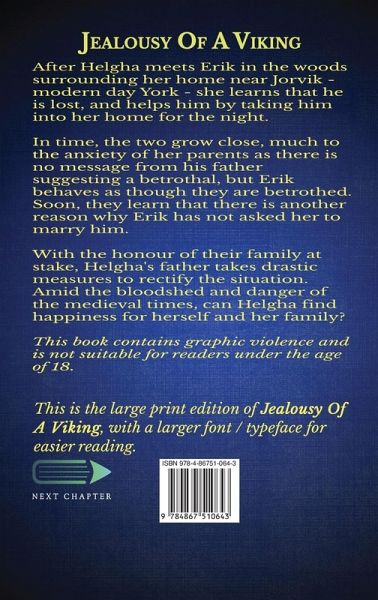 After Helgha meets Erik in the woods surrounding her home near Jorvik - modern day York - she learns that he is lost, and helps him by taking him into her home for the night. In time, the two grow close, much to the anxiety of her parents as there is no message from his father suggesting a betrothal, but Erik behaves as though they are betrothed. Soon, they learn that there is another reason why Erik has not asked her to marry him. With the honour of their family at stake, Helgha's father takes drastic measures to rectify the situation. Amid the bloodshed and danger of the medieval times, can Helgha find happiness for herself and her family? This book contains graphic violence and is not suitable for readers under the age of 18. This is the large print edition of Jealousy Of A Viking, with a larger font / typeface for easier reading.