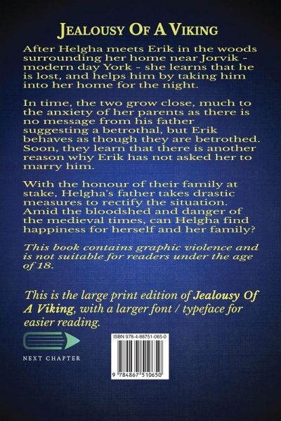 After Helgha meets Erik in the woods surrounding her home near Jorvik - modern day York - she learns that he is lost, and helps him by taking him into her home for the night. In time, the two grow close, much to the anxiety of her parents as there is no message from his father suggesting a betrothal, but Erik behaves as though they are betrothed. Soon, they learn that there is another reason why Erik has not asked her to marry him. With the honour of their family at stake, Helgha's father takes drastic measures to rectify the situation. Amid the bloodshed and danger of the medieval times, can Helgha find happiness for herself and her family? This book contains graphic violence and is not suitable for readers under the age of 18. This is the large print edition of Jealousy Of A Viking, with a larger font / typeface for easier reading.