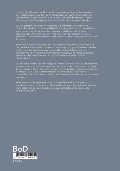 "Jean-Arthur Rimbaud" de Paterne Berrichon est une biographie exhaustive et introspective qui plonge dans la vie tumultueuse et l'oeuvre énigmatique du célèbre poète français. Berrichon, qui a épousé la soeur de Rimbaud, Isabelle, offre une perspective unique et personnelle sur la vie de ce génie littéraire. Le livre commence par explorer l'enfance et l'adolescence de Rimbaud à Charleville, décrivant un jeune prodige dont le talent précoce pour la poésie se manifeste très tôt. Berrichon met en lumière les influences familiales et éducatives qui ont façonné l'esprit rebelle et créatif de Rimbaud. Il détaille également l'impact des événements politiques et sociaux de l'époque sur sa vision du monde. Berrichon examine ensuite les années parisiennes de Rimbaud, où il rencontre Paul Verlaine. Cette relation orageuse, marquée par des passions intenses et des conflits violents, est décrite avec une grande sensibilité. L'auteur explore comment cette période influence la production poétique de Rimbaud, donnant naissance à des chefs-d'oeuvre tels que "Une saison en enfer" et "Les Illuminations". Le livre suit Rimbaud dans ses voyages à travers l'Europe et au-delà, dévoilant un homme en quête de nouvelles expériences et de sens. Berrichon retrace les étapes de cette errance, depuis les séjours à Bruxelles et à Londres jusqu'aux expéditions en Afrique. Il souligne la transformation de Rimbaud, passant de poète visionnaire à aventurier et marchand, cherchant toujours à échapper à ses démons intérieurs. Berrichon s'attarde également sur la fin de vie de Rimbaud, marquée par la maladie et le retour en France. Il offre une description poignante de ses derniers jours, entouré de sa famille, et de son influence durable sur la poésie et la littérature française. "Jean-Arthur Rimbaud" de Paterne Berrichon est une biographie riche en détails et en émotions, qui capture l'essence d'un des plus grands poètes de l'histoire. À travers une narration vivante et érudite, Berrichon nous invite à redécouvrir Rimbaud sous un angle intime et authentique.