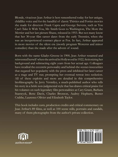 Blonde, vivacious Jean Arthur is best remembered today for her unizue, childlike voice and for the handful of classic Thirties and Forties movies she made for directors Frank Capra and George Stevens, such as You Can't Take It With You, Mr. Smith Goes to Washington, The More the Merrier and her last picture Shane, released in 1953. But not many know that her 30-year film career dates from the early Twenties, when she was an inexperienced contract player at Fox. In fact, Arthur appeared in more movies of the silent era (mostly program Westerns and minor comedies) than she made after the advent of sound. Born with the name Gladys Greene in 19-00, Jean Arthur renamed and reinvented herself when she arrived in Hollywood in 1922, fictionizing her background and subtracting eight years from her actual age. Colleagues have recalled the eccentric personality and behind-the-scenes insecurities that negated her popularity with the press and inhibited her later career as a stage and TV star, prompting her eventual retreat into seclusion. All of these exploits and more are detailed in this comprehensive biofilmography by Jerry Vermilye, a much published author who tells his story in a brisk non-judgmental style that has drawn critical praise for his volumes on such legendary film personalities as Cary Grant, Barbara Stanwyck, Bette Davis, Charles Bronson, Audrey Hepburn, Buster Crabbe, Lawrence Olivier. and Elizabeth Taylor. This book includes casts, production credits and critical commentary on Jean Arthur's many films, as well as 100 scene stills, portraits and candids, many of them are photographs from the author's private collection.