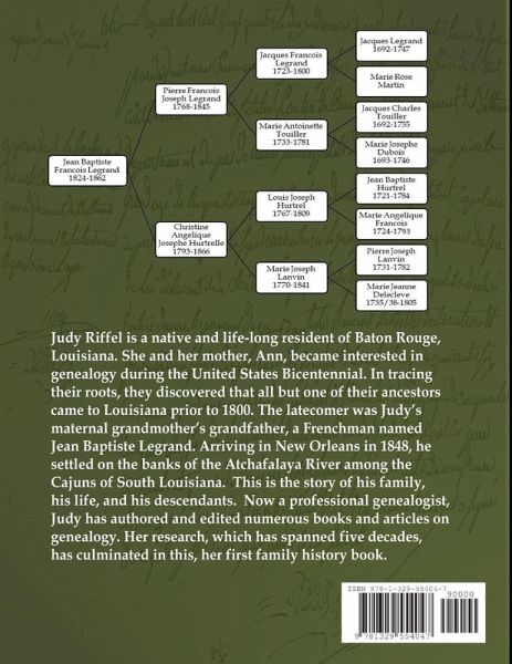 Judy Riffel is a native and life-long resident of Baton Rouge, Louisiana. She and her mother, Ann, became interested in genealogy during the United States Bicentennial. In tracing their roots, they discovered that all but one of their ancestors came to Louisiana prior to 1800. The latecomer was Judy's maternal grandmother's grandfather, a Frenchman named Jean Baptiste Legrand. Arriving in New Orleans in 1848, he settled on the banks of the Atchafalaya River among the Cajuns of South Louisiana. This is the story of his family, his life, and his descendants. Now a professional genealogist, Judy has authored and edited numerous books and articles on genealogy. Her research, which has spanned five decades, has culminated in this, her first family history book.