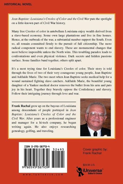 Jean Baptiste: Louisiana's Creoles of Color and the Civil War puts the spotlight on a little-known part of Civil War history. Many free Creoles of color in antebellum Louisiana enjoy wealth derived from a slave-based economy. Some own large plantations and live in fine homes. Hence, at the outbreak of the war, a substantial number support the South. Even so, all remain committed firmly to the pursuit of full citizenship. The more radical component wants to end slavery. These are monumental changes that most believe impossible unless the North wins. This troubling paradox leads to confrontations and even physical violence. Dark secrets and hidden passions surface. Some families band together, others split apart. It's a most trying time for Louisiana's Creoles of color. Their story is told through the lives of two of their very courageous young people, Jean Baptiste and Adélaïde Marie. The two meet when Jean Baptiste seeks medical help for a wound sustained fighting slave catchers. Adélaïde Marie, the beautiful young daughter of a Yankee medical doctor removes the bullet from his arm and puts joy in his heart. Together they bravely oppose the Confederacy and slavery. Follow their intriguing journey through love and war.