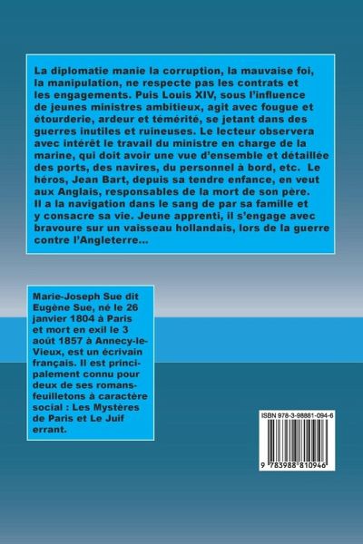 La diplomatie manie la corruption, la mauvaise foi, la manipulation, ne respecte pas les contrats et les engagements. Puis Louis XIV, sous l'influence de jeunes ministres ambitieux, agit avec fougue et étourderie, ardeur et témérité, se jetant dans des guerres inutiles et ruineuses. Le lecteur observera avec intérêt le travail du ministre en charge de la marine, qui doit avoir une vue d'ensemble et détaillée des ports, des navires, du personnel à bord, etc. Le héros, Jean Bart, depuis sa tendre enfance, en veut aux Anglais, responsables de la mort de son père. Il a la navigation dans le sang de par sa famille et y consacre sa vie. Jeune apprenti, il s'engage avec bravoure sur un vaisseau hollandais, lors de la guerre contre l'Angleterre...