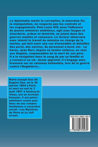 La diplomatie manie la corruption, la mauvaise foi, la manipulation, ne respecte pas les contrats et les engagements. Puis Louis XIV, sous l'influence de jeunes ministres ambitieux, agit avec fougue et étourderie, ardeur et témérité, se jetant dans des guerres inutiles et ruineuses. Le lecteur observera avec intérêt le travail du ministre en charge de la marine, qui doit avoir une vue d'ensemble et détaillée des ports, des navires, du personnel à bord, etc. Le héros, Jean Bart, depuis sa tendre enfance, en veut aux Anglais, responsables de la mort de son père. Il a la navigation dans le sang de par sa famille et y consacre sa vie. Jeune apprenti, il s'engage avec bravoure sur un vaisseau hollandais, lors de la guerre contre l'Angleterre...