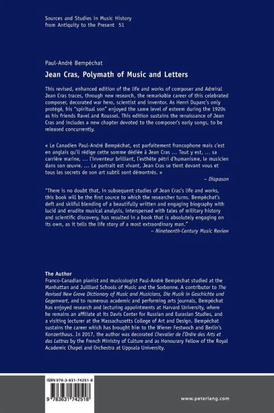 This revised, enhanced edition of the life and works of composer and Admiral Jean Cras traces, through new research, the remarkable career of this celebrated composer, decorated war hero, scientist and inventor. As Henri Duparc's only protégé, his "spiritual son" enjoyed the same level of esteem during the 1920s as his friends Ravel and Roussel. This edition sustains the renaissance of Jean Cras and includes a new chapter devoted to the composer's early songs, to be released concurrently.