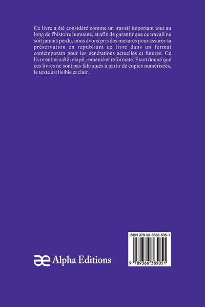 Jean de Kerdren" est un livre classique, qui a eu une valeur significative tout au long de l'histoire, et pour garantir que sa sagesse intemporelle ne soit jamais perdue, Alpha Editions l'a soigneusement préservé en le republiant dans un format moderne et accessible aux générations présentes et futures. Soigneusement reformaté, retapé , et nouvellement conçue, cette édition offre un texte clair et lisible, sans copies numérisées de l'uvre originale, Alpha Editions se consacre à insuffler une nouvelle vie aux livres anciens et classiques, rendant ces trésors littéraires à nouveau disponibles pour les lecteurs qui chérissent l'histoire. culture et savoir intemporel.