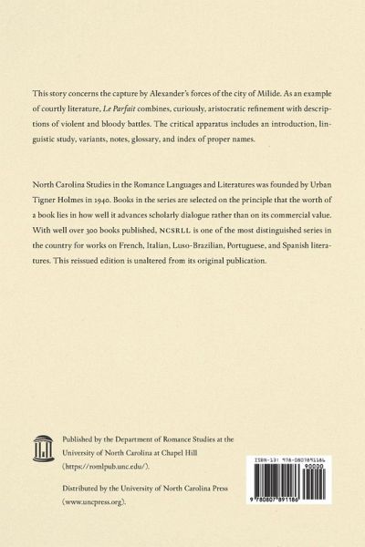 This story concerns the capture by Alexander's forces of the city of Milide. As an example of courtly literature, Le Parfait combines, curiously, aristocratic refinement with descriptions of violent and bloody battles. The critical apparatus includes an introduction, linguistic study, variants, notes, glossary, and index of proper names.