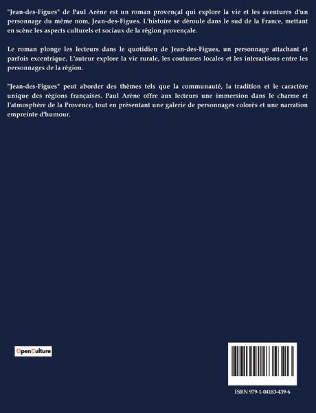 "Jean-des-Figues" de Paul Arène est un roman provençal qui explore la vie et les aventures d'un personnage du même nom, Jean-des-Figues. L'histoire se déroule dans le sud de la France, mettant en scène les aspects culturels et sociaux de la région provençale. Le roman plonge les lecteurs dans le quotidien de Jean-des-Figues, un personnage attachant et parfois excentrique. L'auteur explore la vie rurale, les coutumes locales et les interactions entre les personnages de la région. "Jean-des-Figues" peut aborder des thèmes tels que la communauté, la tradition et le caractère unique des régions françaises. Paul Arène offre aux lecteurs une immersion dans le charme et l'atmosphère de la Provence, tout en présentant une galerie de personnages colorés et une narration empreinte d'humour.