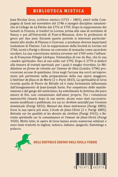 Jean-Nicolas Grou, scrittore mistico (1731 - 1803), entrò nella Compagnia di Gesù nel novembre del 1746 e insegnò discipline umanistiche al College de La Flèche dal 1751 al 1755. Dopo la soppressione dei Gesuiti in Francia, si trasferì in Lorena, prima alla casa di noviziato di Nancy e poi all'Università di Pontà-Mousson, dove fu professore di greco per due anni. Durante questo periodo si interessò particolarmente allo studio di Platone e Cicerone, e produsse diverse importanti traduzioni di Platone. Con la soppressione della Società in Lorena nel 1766, tornò a Parigi e diresse un convento di monache come sacerdote secolare. La sua conversione mistica avvenne nel 1769 sotto l'influenza di Françoise-Pélagie Lévêque, Visitandina di rue du Bac, che fu sua madre spirituale fino al suo esilio nel 1792. Dopo il 1770 si dedicò alla stesura di trattati spirituali, per i quali è meglio ricordato. Le Méditations en forme de retraite sur l'amour de Dieu (Londra 1796) provocarono accuse di quietismo. Grou negò l'accusa ma cercò un'espressione più pertinente nella preparazione della sua opera maggiore, L'intérieur de Jésus et de Marie (2 v. Paris 1815). La spiritualità di Grou ricorda quella di Pierre de Bérulle ed è stata fortemente influenzata dall'insegnamento di Jean-Joseph Surin. Pur sospettoso delle manifestazioni e del gergo del misticismo, ha sottolineato la dottrina del puro amore di Dio, non contaminato dall'amor proprio. Tra i voluminosi manoscritti rimasti dopo la sua morte, alcuni sono stati successivamente modificati e pubblicati, tra cui Le chrétien sanctifié par l'oraison dominicale (Parigi 1832); Manuel des âmes intérieures (Parigi 1883), forse la sua opera più nota; L'école de Jésus-Christ (2 v. Parigi 1885); Retraite sur les qualités et les devoirs du chrétien (Parigi 1913); e Retraite spirituelle sur la connaissance et l'amour de Jésus-Christ (Parigi 1920). Molto lette, le opere di Grou hanno avuto numerose edizioni e sono state tradotte in inglese, tedesco, italiano, spagnolo, fiammingo e polacco.