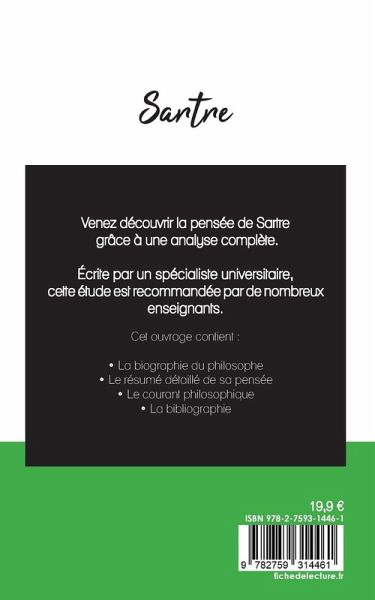 Venez découvrir la pensée de Sartre grâce à une analyse philosophique de référence ! Écrite par un spécialiste universitaire, cette étude est recommandée par de nombreux enseignants. Cet ouvrage contient notamment la biographie du philosophe, le résumé détaillé de sa pensée, ainsi que l'analyse de son courant philosophique. Retrouvez tous nos titres sur : www.fichedelecture.fr.