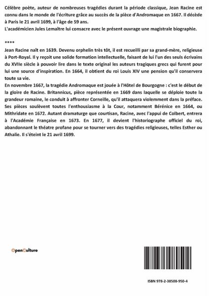 Célèbre poète, auteur de nombreuses tragédies durant la période classique, Jean Racine est connu dans le monde de l'écriture grâce au succès de la pièce d'Andromaque en 1667. Il décède à Paris le 21 avril 1699, à l'âge de 59 ans. L'académicien Jules Lemaître lui consacre avec le présent ouvrage une magistrale biographie. **** Jean Racine naît en 1639. Devenu orphelin très tôt, il est recueilli par sa grand-mère, religieuse à Port-Royal. Il y reçoit une solide formation intellectuelle, faisant de lui l'un des seuls écrivains du XVIIe siècle à pouvoir lire dans le texte original les auteurs tragiques grecs qui furent pour lui une source d'inspiration. En 1664, il obtient du roi Louis XIV une pension qu'il conservera toute sa vie. En novembre 1667, la tragédie Andromaque est jouée à l'Hôtel de Bourgogne : c'est le début de la gloire de Racine. Britannicus, pièce représentée en 1669 dans laquelle se déploie toute la grandeur romaine, le conduit à affronter Corneille, qu'il attaquera violemment dans la préface. Ses pièces soulèvent toutes l'enthousiasme à la Cour, notamment Bérénice en 1664, ou Mithridate en 1672. Autant dramaturge que courtisan, Racine, avec l'appui de Colbert, entrera à l'Académie Française en 1673. En 1677, il devient l'historiographe officiel du roi, abandonnant le théatre profane pour se tourner vers des tragédies religieuses, telles Esther ou Athalie. Il s'éteint le 21 avril 1699.
