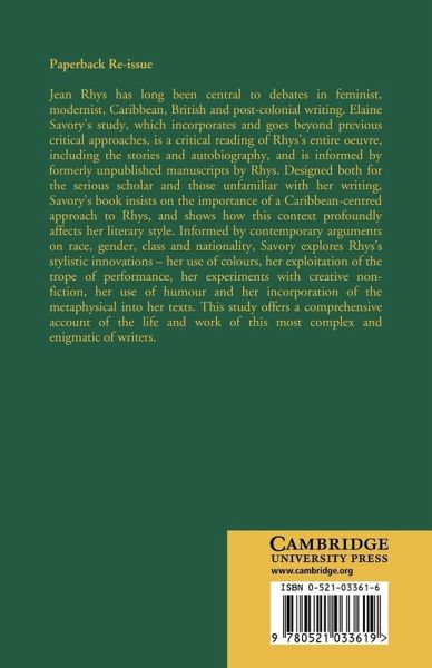Jean Rhys has long been central to debates in feminist, modernist, Caribbean, British and postcolonial writing. Elaine Savory's study, which incorporates and modifies previous critical approaches, is a critical reading of Rhys's entire oeuvre, including the stories and autobiography, and is informed by Rhys's own manuscripts. Designed both for the serious scholar on Rhys and those unfamiliar with her writing, Savory's book insists on the importance of a Caribbean-centred approach to Rhys, and shows how this context profoundly affects her literary style. Informed by contemporary arguments on race, gender, class and nationality, Savory explores Rhys's stylistic innovations - her use of colours, her exploitation of the trope of performance, her experiments with creative non-fiction and her incorporation of the metaphysical into her texts. This study offers a comprehensive account of the life and work of this most complex and enigmatic of writers.