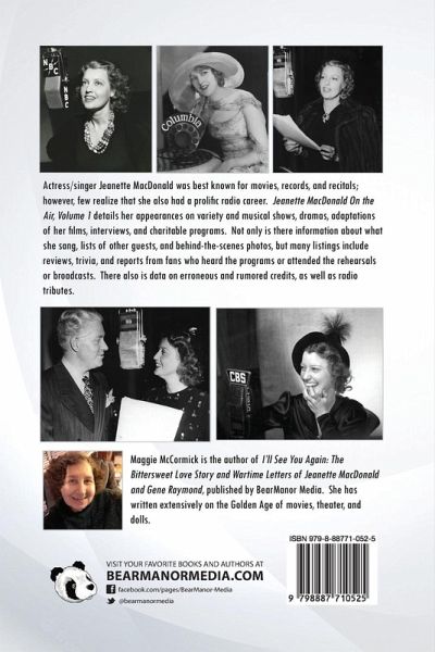 Actress/singer Jeanette MacDonald was best known for movies, records, and recitals; however, few realize that she also had a prolific radio career. Jeanette MacDonald On the Air, Volume 1 details her appearances on variety and musical shows, dramas, adaptations of her films, interviews, and charitable programs. Not only is there information about what she sang, lists of other guests, and behind-the-scenes photos, but many listings include reviews, trivia, and reports from fans who heard the programs or attended the rehearsals or broadcasts. There also is data on erroneous and rumored credits, as well as radio tributes. Maggie McCormick is the author of I'll See You Again: The Bittersweet Love Story and Wartime Letters of Jeanette MacDonald and Gene Raymond, published by BearManor Media. She has written extensively on the Golden Age of movies, theater, and dolls.