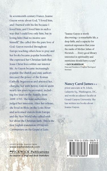 In seventeenth-century France, Jeanne Guyon wrote about God, ""I loved him, and I burned with his fire because I loved him, and I loved him in such a way that I could love only him, but in loving him I had no motive save himself."" She called this the pure love of God. Guyon traveled throughout Europe teaching others how to pray and her books became popular bestsellers. She expressed her Christian faith that Jesus Christ lives within our interior life. As Guyon became increasingly popular, the church and state authorities used the power of the Roman Catholic Inquisition and arrested her, charging her with heresy. Guyon spent nearly ten years incarcerated, including five years in the Bastille from 1698-1703. The state authorities judged her innocent. After her release, she lived in Blois on the Loire River and welcomed visitors from Europe and the New World who talked with her about the Christian faith. This is the first English translation of Guyon's Commentary on the Gospel of Luke. ""Jeanne Guyon is worth discovering--a remarkable life, a deep faith, and a capacity for mystical expression that joins the ranks of Mother Julian of Norwich . . . Every good library interested in spirituality and mysticism should have a copy."" --Ian Markham, Dean and President of Virginia Theological Seminary Nancy Carol James is a priest associate at St. John's, Lafayette Sq., Washington, DC, and works as adjunct faculty at Grand Canyon University. She has written ten books about Jeanne Guyon.