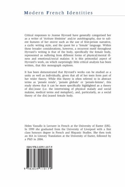 Critical responses to Jeanne Hyvrard have generally categorised her as a writer of 'écriture féminine' and/or autobiography, due to salient features of her oeuvre such as the use of first-person narrative, a cyclic writing style, and the quest for a 'female' language. Within these broader considerations, however, a recurrent motif throughout Hyvrard's writing is that of the body, specifically the female body, represented as suffering from different forms of physical/mental illness and emotional/social malaise. It is this primordial aspect of Hyvrard's work, on which surprisingly little critical analysis has been written, that this monograph explores.