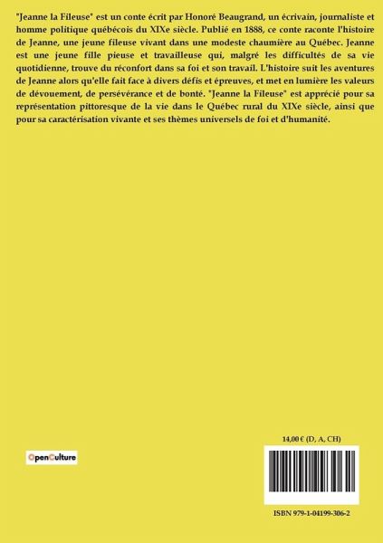 "Jeanne la Fileuse" d'Honoré Beaugrand est un roman qui explore les thèmes de l'émigration franco-canadienne vers les États-Unis au XIXe siècle, tout en abordant les questions d'identité culturelle et de loyauté nationale. Le récit s'ouvre sur une préface où l'auteur exprime son désir de corriger les idées fausses sur les Canadiens français émigrés, souvent perçus comme misérables et asservis. Beaugrand insiste sur le fait que ces émigrés, bien qu'ayant quitté leur terre natale, conservent leur identité et leur influence dans leur nouveau pays d'accueil. Le roman est divisé en deux parties principales. La première partie, "Les campagnes du Canada", décrit la vie rurale au Canada français, mettant en lumière les traditions et les valeurs des habitants. La deuxième partie, "Les filatures de l'étranger", suit l'histoire d'une famille émigrée, illustrant les défis et les opportunités rencontrés par les Canadiens français aux États-Unis. À travers le personnage de Pierre Montépel, un jeune homme éduqué et en évolution, Beaugrand explore les tensions entre les aspirations personnelles et les attentes familiales, ainsi que les dilemmes liés à l'émigration. Le roman est également ponctué de récits et de légendes locales, comme celle du "Fantôme de l'avare", qui enrichissent le texte de références culturelles et historiques. En adoptant la forme du roman populaire, Beaugrand parvient à toucher un large public, tout en offrant une réflexion sur les conséquences de l'émigration et la préservation de l'identité franco-canadienne.