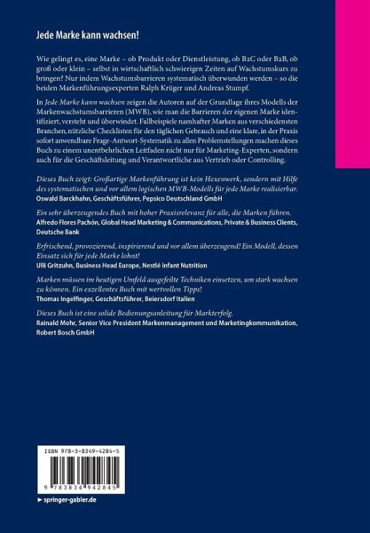 Wie gelingt es, eine Marke - ob Produkt oder Dienstleistung, ob B2C oder B2B, ob groß oder klein - selbst in wirtschaftlich schwierigen Zeiten auf Wachstumskurs zu bringen? Nur indem Wachstumsbarrieren systematisch überwunden werden - so die beiden Markenführungsexperten Ralph Krüger und Andreas Stumpf. In "Jede Marke kann wachsen" zeigen die Autoren auf der Grundlage ihres Modells der Markenwachstumsbarrieren (MWB), wie man die Barrieren der eigenen Marke identifiziert, versteht und überwindet. Fallbeispiele namhafter Marken aus verschiedensten Branchen, nützliche Checklisten für den täglichen Gebrauch und eine klare, in der Praxis sofort anwendbare Frage-Antwort-Systematik zu allen Problemstellungen machen dieses Buch zu einem unentbehrlichen Leitfaden nicht nur für Marketing-Experten, sondern auch für die Geschäftsleitung und Verantwortliche aus Vertrieb oder Controlling. "Dieses Buch zeigt: Großartige Markenführung ist kein Hexenwerk, sondern mit Hilfe des systematischen und vor allem logischen MWB-Modells für jede Marke realisierbar." Oswald Barckhahn , Geschäftsführer, Pepsico Deutschland GmbH "Ein sehr überzeugendes Buch mit hoher Praxisrelevanz für alle, die Marken führen." Alfredo Flores Pachón, Global Head Marketing & Communications, Private & Business Clients, Deutsche Bank "Erfrischend, provozierend, inspirierend und vor allem überzeugend! Ein Modell, dessen Einsatz sich für jede Marke lohnt!" Ulli Gritzuhn, Business Head Europe, Nestlé Infant Nutrition "Marken müssen im heutigen Umfeld ausgefeilte Techniken einsetzen, um stark wachsen zu können. Ein exzellentes Buch mit wertvollen Tipps!" Thomas Ingelfinger, Geschäftsführer, Beiersdorf Italien "Dieses Buch ist eine solide Bedienungsanleitung für Markterfolg." Rainald Mohr, Senior Vice President Markenmanagement und Marketingkommunikation, Robert Bosch GmbH