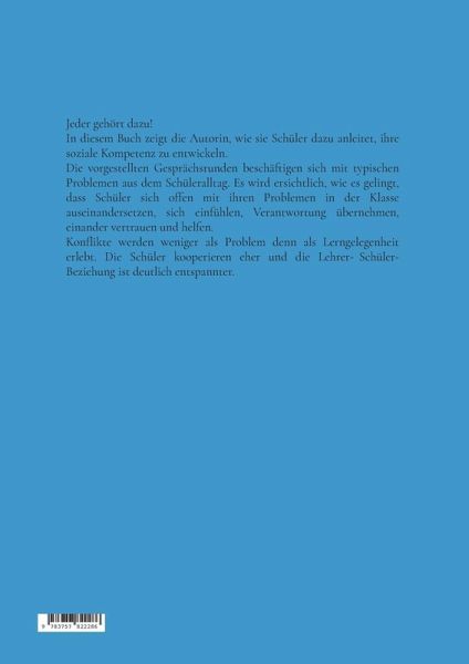 Jeder gehört dazu!In diesem Buch zeigt die Autorin, wie sie Schüler dazu anleitet, ihre soziale Kompetenz zu entwickeln. Die vorgestellten Gesprächsrunden beschäftigen sich mit typischen Problemen aus dem Schüleralltag. Es wird ersichtlich, wie es gelingt, dass Schüler sich offen mit ihren Problemen in der Klasse auseinandersetzen, sich einfühlen, Verantwortung übernehmen, einander vertrauen und helfen. Konflikte werden weniger als Problem denn als Lerngelegenheit erlebt. Die Schüler kooperieren eher und die Lehrer-Schüler-Beziehung ist deutlich entspannter.