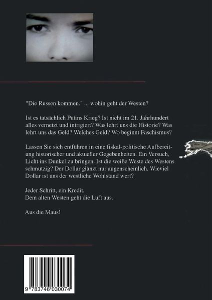 "Die Russen kommen." ... wohin geht der Westen? Ist es tatsächlich Putins Krieg? Ist nicht im 21. Jahrhundert alles vernetzt und intrigiert? Was lehrt uns die Historie? Was lehrt uns das Geld? Welches Geld? Wo beginnt Faschismus?Lassen Sie sich entführen in eine fiskal-politische Aufbereitung historischer und aktueller Gegebenheiten. Ein Versuch, Licht ins Dunkel zu bringen. Ist die weiße Weste des Westens schmutzig? Der Dollar glänzt nur augenscheinlich. Wieviel Dollar ist uns der westliche Wohlstand wert? Jeder Schritt, ein Kredit. Dem alten Westen geht die Luft aus.Aus die Maus!