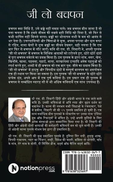 The greatest part of life is the childhood. Its real worth is realized only after it has gone, years behind. Children can never understand, what childhood is. Once childhood has gone, you can never get it back, what would remain with you, are the reminiscences of it. This wonderful part of the life is entirely free from: worries, selfishness, cunningness, woes of earning money etc. No one else, except a child can have the great fun and pleasure of the childhood. Everyone craves to live his or her childhood once again, but this dream never becomes true. You can enjoy the childhood, only by pondering those acts or events or watching the naivety and simplicity of the playing children; heart is filled with an incredible pleasure on seeing the innocent acts of the children. Touching the various aspects of childhood whether children of villages, towns or cities; their toys, tricks, games, innocence, foods, dresses, studies, school, relations and many other things, Poet S. D. Tiwari has composed his verses to include the marvelous pictures of all of these in his book 'Jee Lo Bachpan'. The book containing these spectacular three lined verses take you back to your childhood, years behind. By reading these verses you may feel that you are living yet in your childhood. Each verse of this book is a complete poem, drawing the image of a particular event, moment or aspect of the childhood; thus more than 1100 poems are available to readers in a single book 'Jee Lo Bachpan' जी लो बचपन.