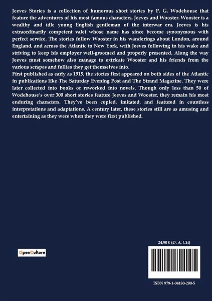 Jeeves Stories is a collection of humorous short stories by P. G. Wodehouse that feature the adventures of his most famous characters, Jeeves and Wooster. Wooster is a wealthy and idle young English gentleman of the interwar era. Jeeves is his extraordinarily competent valet whose name has since become synonymous with perfect service. The stories follow Wooster in his wanderings about London, around England, and across the Atlantic to New York, with Jeeves following in his wake and striving to keep his employer well-groomed and properly presented. Along the way Jeeves must somehow also manage to extricate Wooster and his friends from the various scrapes and follies they get themselves into. First published as early as 1915, the stories first appeared on both sides of the Atlantic in publications like The Saturday Evening Post and The Strand Magazine. They were later collected into books or reworked into novels. Though only less than 50 of Wodehouse¿s over 300 short stories feature Jeeves and Wooster, they remain his most enduring characters. They¿ve been copied, imitated, and featured in countless interpretations and adaptations. A century later, these stories still are as amusing and entertaining as they were when they were first published.