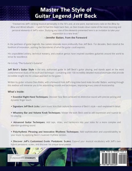 Master The Guitar Style of Jeff Beck In the pantheon of guitar legends, few names resonate more profoundly than Jeff Beck. For decades, Beck stood at the forefront of innovation, pushing the boundaries of what the guitar could express. His unparalleled artistry, technical mastery, and creative genius have inspired countless guitarists around the world to strive for excellence. He is truly "The Guitarist's Guitarist". Jeff Beck's Guitar Style is the only authorised guide to Jeff Beck's guitar playing, and stands apart as the most comprehensive study of his style and technique - containing over 130 incredibly detailed musical examples that provide incredible insight into his unique approach to the guitar. Written by guitar virtuoso Dani Rabin, with a foreword from Jeff's long-time band mate Jennifer Batten, working through this method will immerse you in his astonishing sounds and techniques, improving every area of musicianship. What's Inside: Essential Right-Hand Techniques: Discover how Beck achieved his distinctive sound with precise picking and dynamic finger touch. Signature Jeff Beck Licks: Learn iconic licks that capture the essence of Beck's style - each explained in detail. Whammy Bar and Volume Knob Techniques: Master the tools Beck used to add expression and nuance to his playing. Advanced Guitar Techniques: Add taps, slides, and harmonics into your solos for a more complex and attention-grabbing sound. Polyrhythmic Phrasing and Innovative Rhythmic Techniques: Add sophistication and unpredictability to your music by applying Beck's nuanced rhythmic tension. Discover Jeff's Customised Exotic Pentatonic Scales: Expand your musical vocabulary with Jeff's own hybrid pentatonic scales, and discover his unique tonal palette.