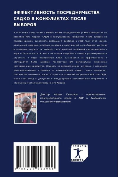 V ätoj knige predstawlen glubokij analiz posrednicheskih usilij Soobschestwa po razwitiü Juga Afriki (SADK) w uregulirowanii konfliktow posle wyborow na primere krizisa, wyzwannogo wyborami w Zimbabwe w 2008 godu. Jetot krizis, otmechennyj shirokomasshtabnym nasiliem i politicheskoj nestabil'nost'ü posle ospariwaniq rezul'tatow wyborow, stal ser'eznoj problemoj dlq regional'nogo mira i bezopasnosti. V knige na osnowe podrobnogo analiza rassmatriwaütsq strategii i mery, primenqemye SADK, oceniwaetsq ih äffektiwnost' i obsuzhdaütsq bolee shirokie posledstwiq dlq regional'nyh mehanizmow uregulirowaniq konfliktow. Opiraqs' na perwoistochniki, interw'ü s klüchewymi zainteresowannymi storonami i srawnitel'nyj analiz, kniga predlagaet kriticheskoe ponimanie sil'nyh storon i ogranichenij posrednicheskoj roli SADK, wnosq swoj wklad w diskussiü o mezhdunarodnom uregulirowanii konfliktow i stremlenii k ustojchiwomu miru na üge Afriki.