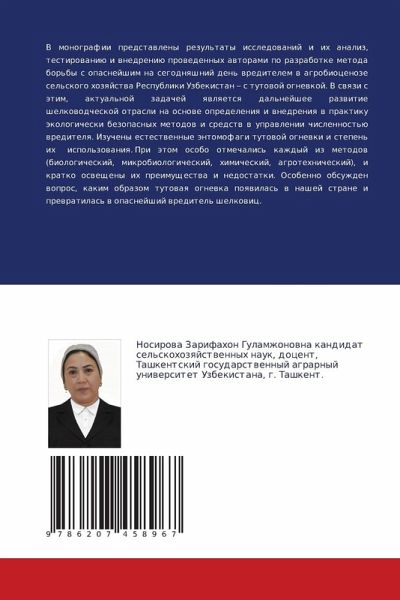 V monografii predstawleny rezul'taty issledowanij i ih analiz, testirowaniü i wnedreniü prowedennyh awtorami po razrabotke metoda bor'by s opasnejshim na segodnqshnij den' wreditelem w agrobiocenoze sel'skogo hozqjstwa Respubliki Uzbekistan - s tutowoj ognewkoj. V swqzi s ätim, aktual'noj zadachej qwlqetsq dal'nejshee razwitie shelkowodcheskoj otrasli na osnowe opredeleniq i wnedreniq w praktiku äkologicheski bezopasnyh metodow i sredstw w uprawlenii chislennost'ü wreditelq. Izucheny estestwennye äntomofagi tutowoj ognewki i stepen' ih ispol'zowaniq. Pri ätom osobo otmechalis' kazhdyj iz metodow (biologicheskij, mikrobiologicheskij, himicheskij, agrotehnicheskij), i kratko oswescheny ih preimuschestwa i nedostatki. Osobenno obsuzhden wopros, kakim obrazom tutowaq ognewka poqwilas' w nashej strane i prewratilas' w opasnejshij wreditel' shelkowic.