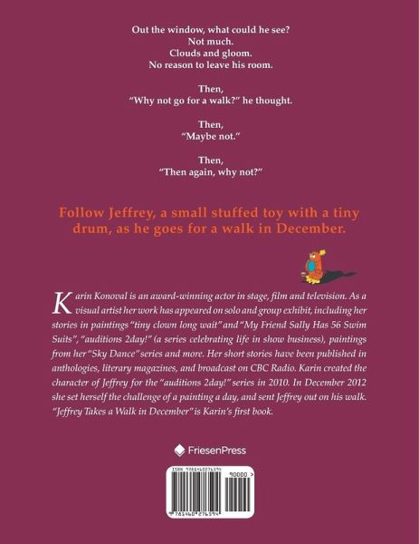 Karin Konoval is an award-winning actor in stage, film and television. As a visual artist her work has appeared on solo and group exhibit, including her stories in paintings "tiny clown long wait" and "My Friend Sally Has 56 Swim Suits", "auditions 2day!" (a series celebrating life in show business), paintings from her "Sky Dance" series and more. Her short stories have been published in anthologies, literary magazines, and broadcast on CBC Radio. Karin created the character of Jeffrey for the "auditions 2day!" series in 2010. In December 2012 she set herself the challenge of a painting a day, and sent Jeffrey out on his walk. "Jeffrey Takes a Walk in December" is Karin's first book.