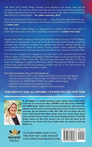 Tragedy often strikes us without warning, like a lightning strike in a storm. For KD Wagner, a lightning bolt of devastation struck her as she drove a tractor trailer through a California mountain pass. Somebody murdered her eighteen-year-old son, Jeffrey. Instantly, her world reduced to the smoke and ashes of every parent's worst nightmare. Wagner chronicles these events in this gut-wrenching narrative of loss, injustice, and finally, hope. From her solo navigation of a dangerous mountain pass to the peaceful internment of Jeffrey's ashes in a Hawaiian cove, Wagner invites the reader on her journey through loss to find a Different Place of life after. Along the way, she shares the tale of Jeffrey's life cut short-his challenges, his gifts, his adventures. Jeffrey: The Injustice of Murder is a tribute to the human spirit and the love between a mother and son, a love that survives the cruelest of lightning strikes, the strike of death. This heart-wrenching story will lead people to: · Feel the Injustice of the United States Law Enforcement and Legal System. · Gain an understanding of "What to Say" and "What Not to Say" after Loss. · Recognize the SHOCK REACTIONS of a sudden violent tragedy. · Discover the long-term consequences of loss. · Believe in the power of LOVE to heal in this life and beyond. TIME DOES NOT HEAL ALL WOUNDS-IT'S HOW YOU USE YOUR TIME!