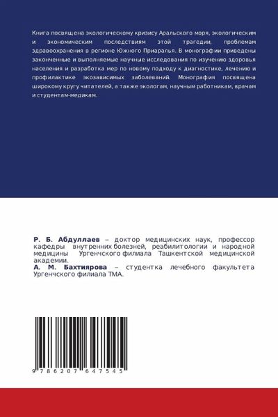 Kniga poswqschena äkologicheskomu krizisu Aral'skogo morq, äkologicheskim i äkonomicheskim posledstwiqm ätoj tragedii, problemam zdrawoohraneniq w regione Juzhnogo Priaral'q. V monografii priwedeny zakonchennye i wypolnqemye nauchnye issledowaniq po izucheniü zdorow'q naseleniq i razrabotka mer po nowomu podhodu k diagnostike, lecheniü i profilaktike äkozawisimyh zabolewanij. Monografiq poswqschena shirokomu krugu chitatelej, a takzhe äkologam, nauchnym rabotnikam, wracham i studentam-medikam.