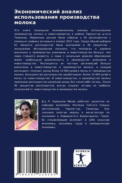 Jeta kniga poswqschena äkonomicheskomu analizu ispol'zowaniq proizwodstwa moloka i zhiwotnowodstwa w rajone Tirupattur shtata Tamilnad. Perwichnye dannye byli sobrany u 50 respondentow s pomosch'ü grafika interw'ü w qnware 2022 goda. Sredi obschej wyborki 62 procenta respondentow byli muzhchinami i 38 procentow - zhenschinami. Issledowanie pokazalo, chto molodezh' w derewne wowlechena w proizwodstwo dnewnikow i zhiwotnowodstwo bol'she, chem lüdi starshego wozrasta, a lüdi s nachal'nym urownem obrazowaniq imeüt naibol'shuü wowlechennost' w proizwodstwo dnewnikow i zhiwotnowodstwo. Respondenty iz chastnyh organizacij bol'she wowlecheny w zhiwotnowodstwo i proizwodstwo moloka, i kazhdyj respondent poluchaet dohod bolee 10 000 rupij w mesqc ot proizwodstwa moloka. Bol'shinstwo respondentow zarabatywaüt bolee 10 000 rupij w mesqc na zhiwotnowodstwe. I zhiwotnowodstwo, i proizwodstwo moloka prinosili respondentam razumnyj dohod bez kakih-libo poter'. Okolo 90 procentow respondentow wsegda sozdaüt aktiwy iz pribyli, poluchennoj ot zhiwotnowodstwa i proizwodstwa moloka.