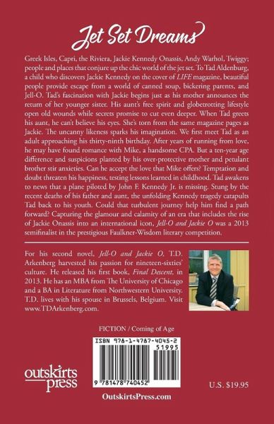 Greek Isles, Capri, the Riviera, Jackie Kennedy Onassis, Andy Warhol, Twiggy; people and places that conjure up the chic world of the jet set. To Tad Aldenburg, a child who discovers Jackie Kennedy on the cover of LIFE magazine, beautiful people provide escape from a world of canned soup, bickering parents, and Jell-O. Tad's fascination with Jackie begins just as his mother announces the return of her younger sister. His aunt's free spirit and globetrotting lifestyle open old wounds while secrets promise to cut even deeper. When Tad greets his aunt, he can't believe his eyes. She's torn from the same magazine pages as Jackie. The uncanny likeness sparks his imagination. We first meet Tad as an adult approaching his thirty-ninth birthday. After years of running from love, he may have found romance with Mike, a handsome CPA. But a ten-year age difference and suspicions planted by his over-protective mother and petulant brother stir anxieties. Can he accept the love that Mike offers? Temptation and doubt threaten his happiness, testing lessons learned in childhood. Tad awakens to news that a plane piloted by John F. Kennedy Jr. is missing. Stung by the recent deaths of his father and aunt, the unfolding Kennedy tragedy catapults Tad back to his youth. Could that turbulent journey help him find a path forward? Capturing the glamour and calamity of an era that includes the rise of Jackie Onassis into an international icon, Jell-O and Jackie O was a 2013 semifinalist in the prestigious Faulkner-Wisdom literary competition.