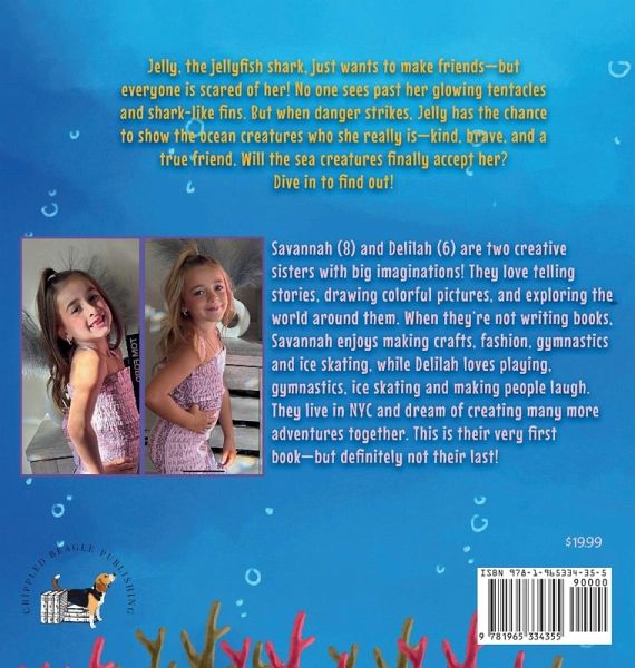 Jelly, the jellyfish shark, just wants to make friends-but everyone is scared of her! No one sees past her glowing tentacles and shark-like fins. But when danger strikes, Jelly has the chance to show the ocean creatures who she really is-kind, brave, and a true friend. Will the sea creatures finally accept her? Dive in to find out! Savannah (8) and Delilah (6) are two creative sisters with big imaginations! They love telling stories, drawing colorful pictures, and exploring the world around them. When they're not writing books, Savannah enjoys making crafts, fashion, gymnastics and ice skating, while Delilah loves playing, gymnastics, ice skating and making people laugh. They live in NYC and dream of creating many more adventures together. This is their very first book-but definitely not their last!