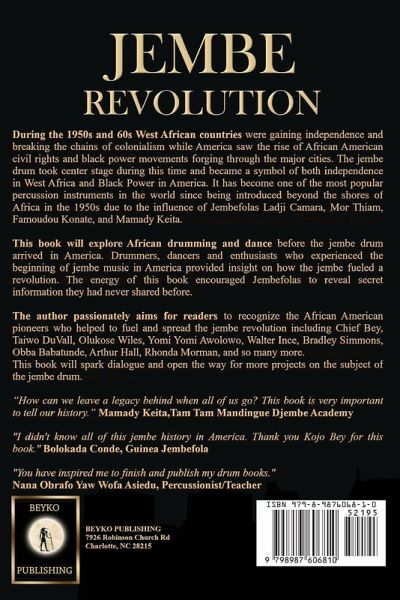 Second Edition The jembe drum is one of the most popular percussion instruments in the world. This book will explore African drumming and dance before the jembe drum arrived in America. Drummers, dancers and enthusiasts who experienced the beginning of jembe music in America provided insight on how the jembe fueled a revolution. The energy of this book encouraged Jembefolas to reveal secret information they had never shared before. The author passionately aims for readers to recognize the African American pioneers who helped to spread the jembe revolution. JEMBE REVOLUTION is the first to congregate so many different voices in one publication to tell this story. This book will spark dialogue and open the way for more projects on the subject of the jembe drum.