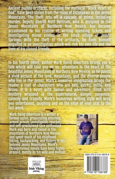 Ancient pueblo artifacts, including the mythical "Black Heart of God" have been stolen from the ruins of Astialakwa in the Jemez Mountains. The theft sets off a cascade of crime, including murder. Deputy Sheriff Matt Bertram, who is assigned to the Jemez Mountains of Northern New Mexico, has become accustomed to his routine of writing speeding tickets and investigating minor crimes in the small village of Jemez Springs. With the theft of the artifacts, he finds himself engulfed in an investigation which will risk his own life and the lives of his closest friends. In his fourth novel, author Mark David Albertson brings you a tale which will take you on an adventure in the heart of the beautiful Jemez Mountains of Northern New Mexico, as he paints a vivid picture of the land, mountains, and the diverse people who live in the Jemez. Mark's inventive imagination brings the reader a cast of characters who are odd, quirky, noble, and brave. It is a novel with humor and adventure, filled with mystery wrapped in the supernatural, danger, suspense, comedy and tragedy. Mark's humorous writing style will keep you entertained, laughing and on the edge of your seat to the last word.