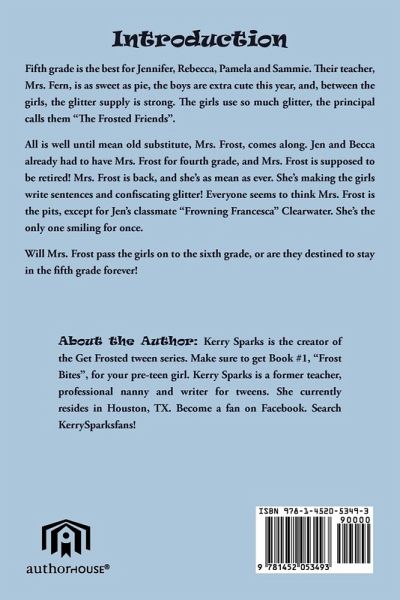Introduction Fifth grade is the best for Jennifer, Rebecca, Pamela and Sammie. Their teacher, Mrs. Fern, is as sweet as pie, the boys are extra cute this year, and, between the girls, the glitter supply is strong. The girls use so much glitter, the principal calls them "The Frosted Friends". All is well until mean old substitute, Mrs. Frost, comes along. Jen and Becca already had to have Mrs. Frost for fourth grade, and Mrs. Frost is supposed to be retired! Mrs. Frost is back, and she's as mean as ever. She's making the girls write sentences and confiscating glitter! Everyone seems to think Mrs. Frost is the pits, except for Jen's classmate "Frowning Francesca" Clearwater. She's the only one smiling for once. Will Mrs. Frost pass the girls on to the sixth grade, or are they destined to stay in the fifth grade forever!