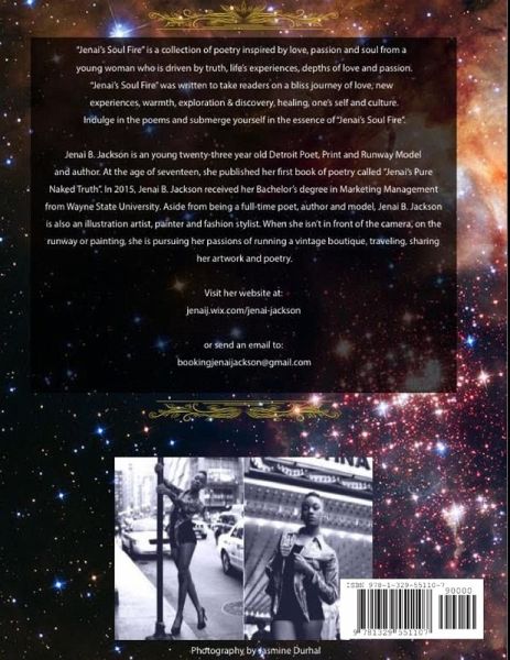 "Jenai's Soul Fire" is a collection of poetry inspired by love, passion and soul from a young woman who is driven by truth, life's experiences, depths of love and passion. "Jenai's Soul Fire" was written to take readers on a bliss journey of love, new experiences, warmth, exploration & discovery, healing, one's self and culture. Indulge in the poems and submerge yourself in the essence of "Jenai's Soul Fire".Jenai B. Jackson is an young twenty-three year old Detroit Poet, Print and Runway Model and author. At the age of seventeen, she published her first book of poetry called "Jenai's Pure Naked Truth". In 2015, Jenai B. Jackson received her Bachelor's degree in Marketing Management from Wayne State University. Aside from being a full-time poet, author and model, Jenai B. Jackson is also an illustration artist, painter and fashion stylist. When she isn't in front of the camera, on the runway or painting, she is pursuing her passions of running a vintage boutique, traveling, sharing her artwork and poetry.