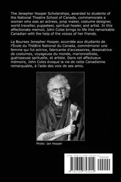Jenepher Hooper was a remarkable Canadian who rebelled against her upbringing to lead a fascinating life in theatre as an actress, set designer, prop maker, costume designer and puppeteer. She became fascinated by Reiki healing and the Spiritual world, and was well known and admired as a Healer. In her later life she became a noted artist based on the shores of Passamaquoddy Bay, New Brunswick, where she brought many of the elements of her richly varied life into her art. Her name will live on through the significant legacy she left to the National Theatre School of Canada, to fund English and French speaking students on the Set and Costume design programme. This affectionate biographical memoir in both English and French has been compiled by former theatrical friend, John Coles, with the help of many of her friends.