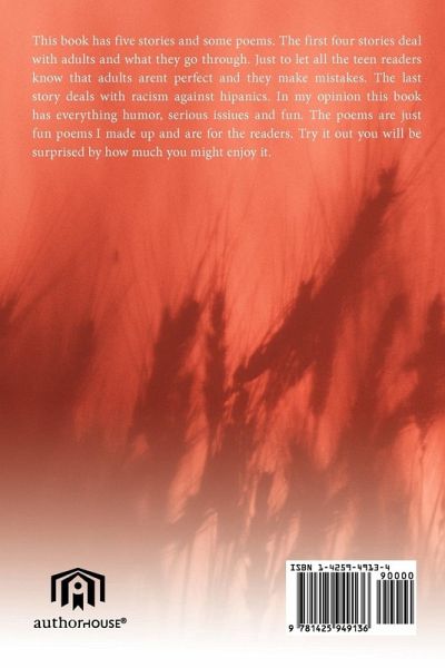 This book has five stories and some poems. The first four stories deal with adults and what they go through. Just to let all the teen readers know that adults arent perfect and they make mistakes. The last story deals with racism against hipanics. In my opinion this book has everything humor, serious issiues and fun. The poems are just fun poems I made up and are for the readers. Try it out you will be surprised by how much you might enjoy it.